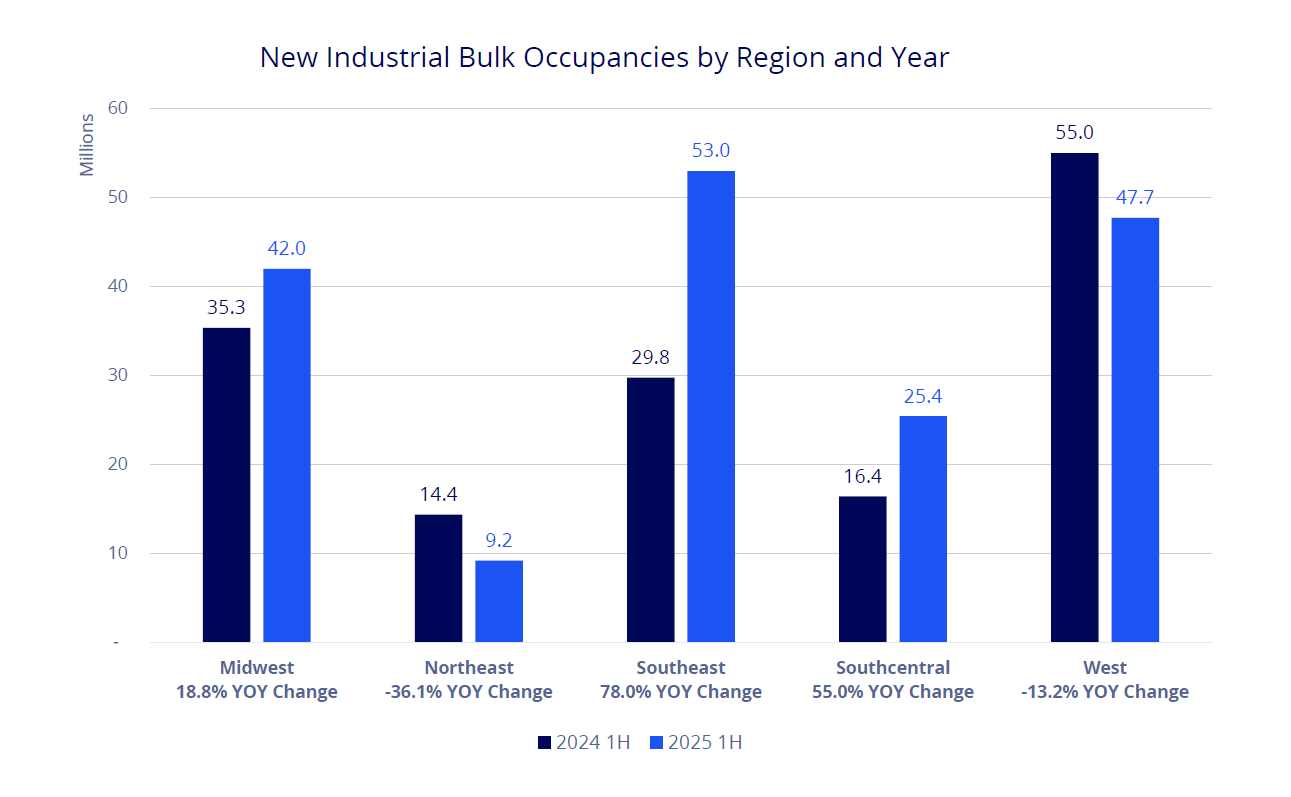 New bulk occupancies grew the most in the Southeast region year-over-year, as 204 users moved into 53M SF, more than in any other region, and 78% higher than the 30M SF in the first half of 2024. While bulk occupancies also grew year-over-year in the Midwest and Southcentral regions, they declined in the West and Northeast regions.