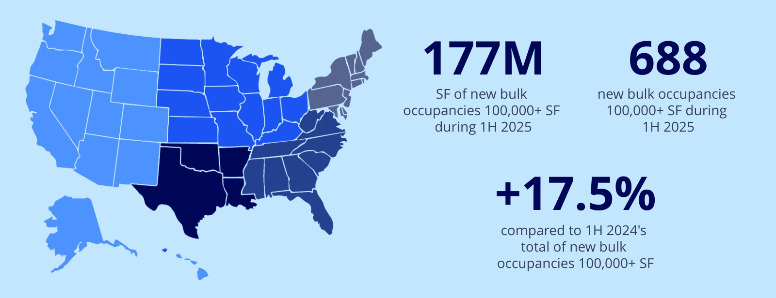 Fifteen new occupancies were 1M SF or larger, compared to 17 in the first half of 2024 and 19 in the first half of 2023. The average transaction size continued to decline, to 258,000 SF in the first half of 2025 from 264,000 SF in 2024, 289,000 SF in 2023, and 309,000 SF in 2022. While the average lease size is smaller, the overall number of bulk occupancies 100,000 SF and larger increased during the first half of 2025 compared to the same period in 2024 and 2023.