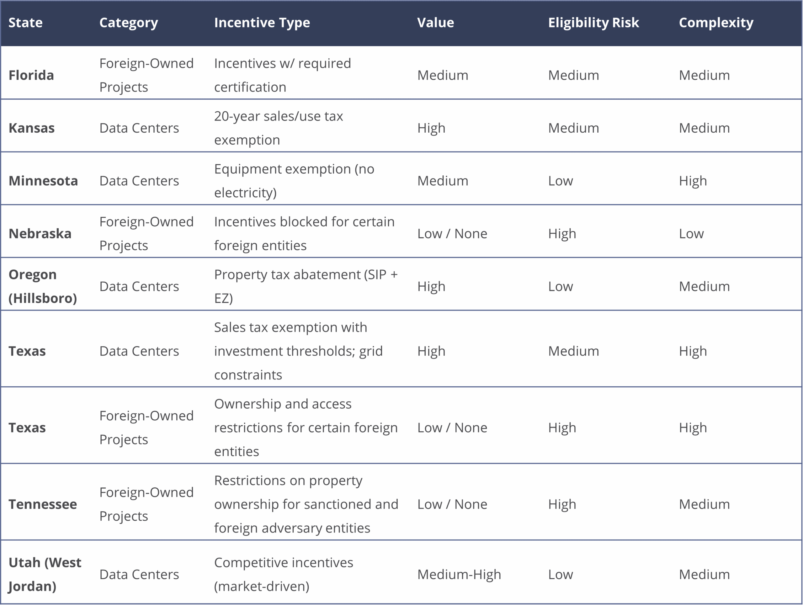 Nebraska guidance states that “foreign adversarial companies” are prohibited from receiving benefits from certain state incentive programs, effective October 1, 2025.⁸ Please note that state restrictions on “foreign adversarial companies” are still evolving.